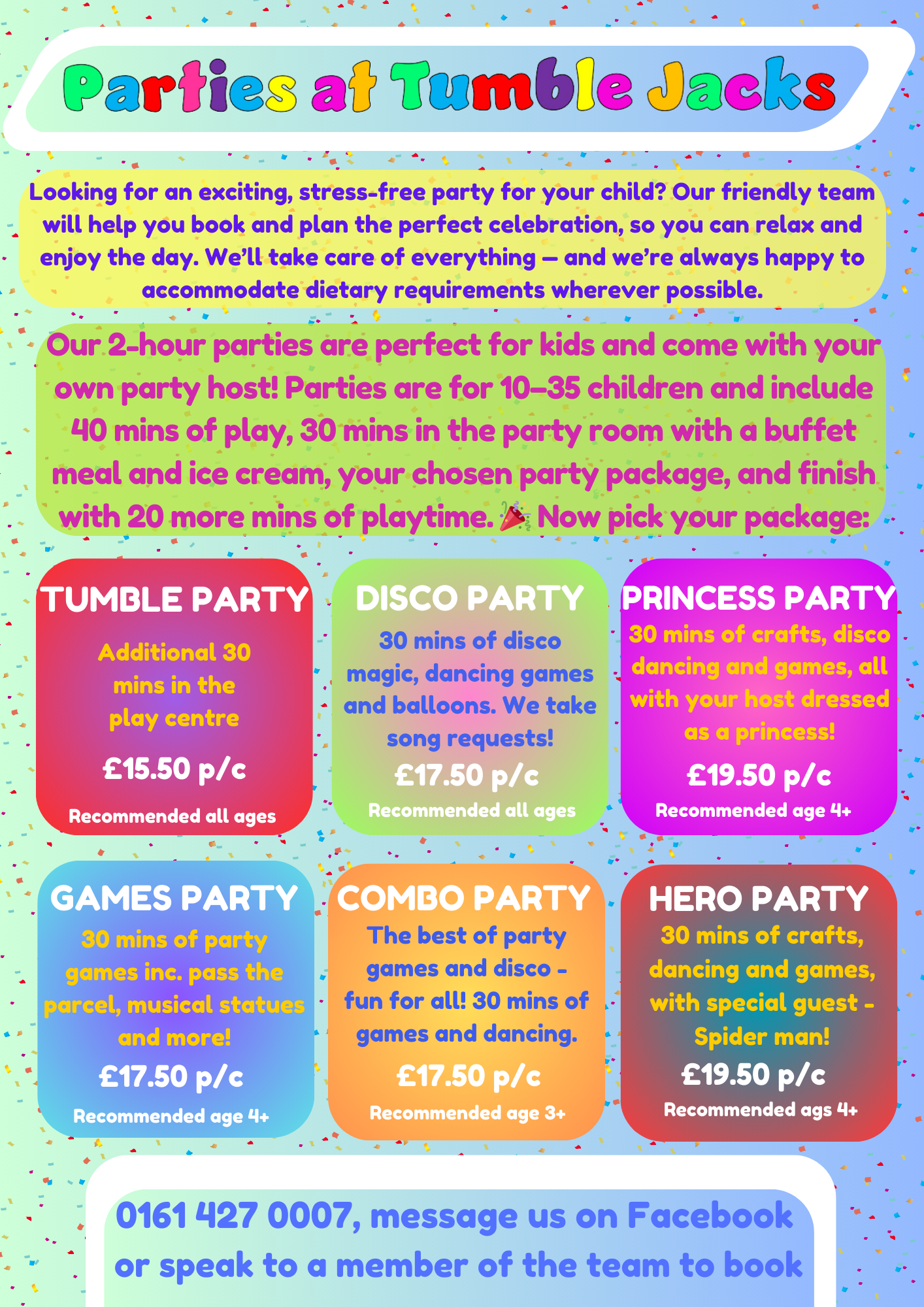 Tumble Jacks specialise in creating unforgettable children’s parties in Stockport! We know that planning a party for your little one can be stressful, which is why we’re here to take the hassle out of the process. With a range of party options to choose from, we’re confident that we can create a celebration that your child will love.
